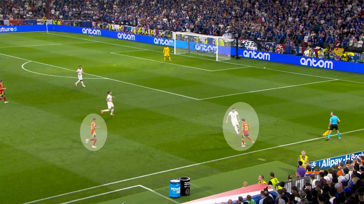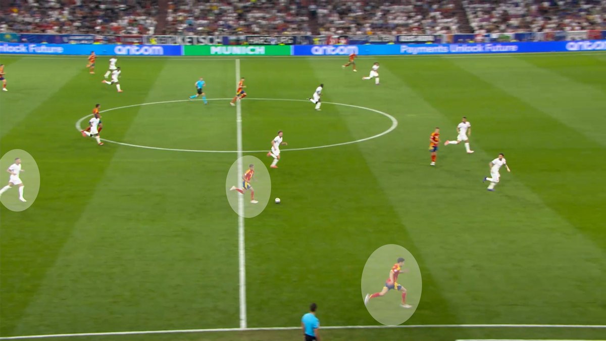 Ayudas constantes para tener superioridad en banda con Nico y Lamine bajando y un centrocampista (Fabián o, sobre todo, Rodri) cerca para ayudar.