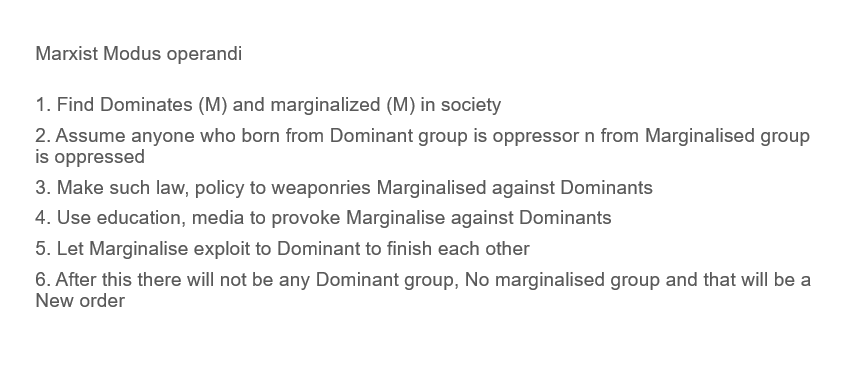 Marxist controlled entire education, media n culture worldwide then they controlled Govt and started weaponizing marginalized to start a clash between dominant and marginalized for NWO