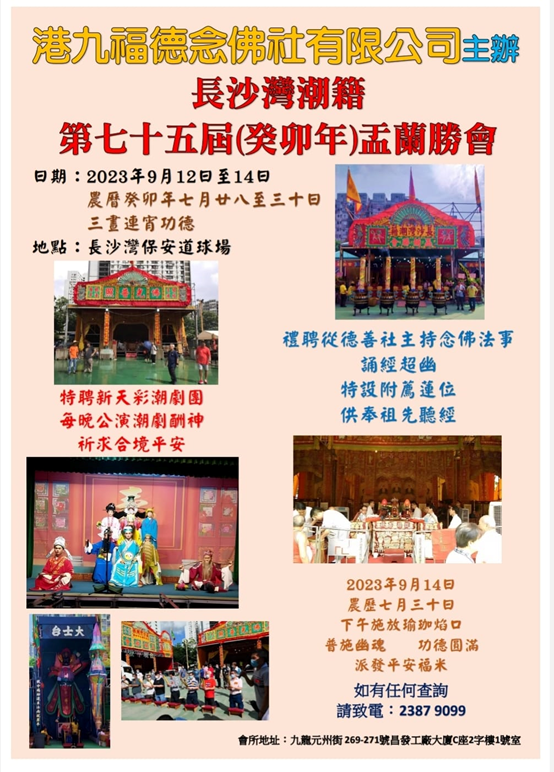 120年历史。19世纪,位于铜锣湾百德新街一带的渣甸仓属怡和洋行,聘用不少潮籍苦力,常有人在搬运时,不慎被迭至数米高的货物压死,同乡便在农历七月聚集拜祭,后来潮州人和英籍经理渣甸共同推动,演变成1897年第一次举行的有规模盂兰胜会,洋行还代为向政府申请,成立了专门负责每年张罗此事的组织- 潮州公和堂。