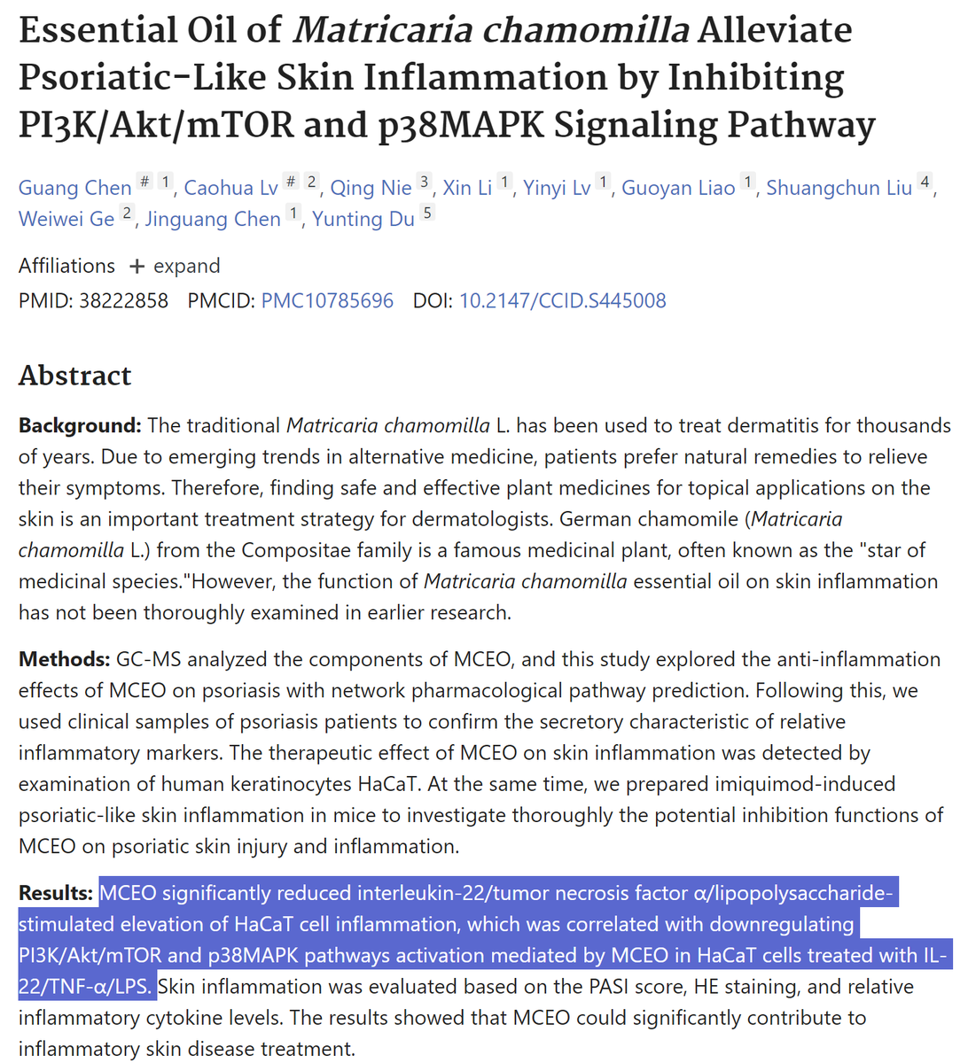 Chamomile essential oil (MCEO) significantly reduced inflammation in human keratinocytes (HaCaT cells) and in a mouse model of psoriasis.