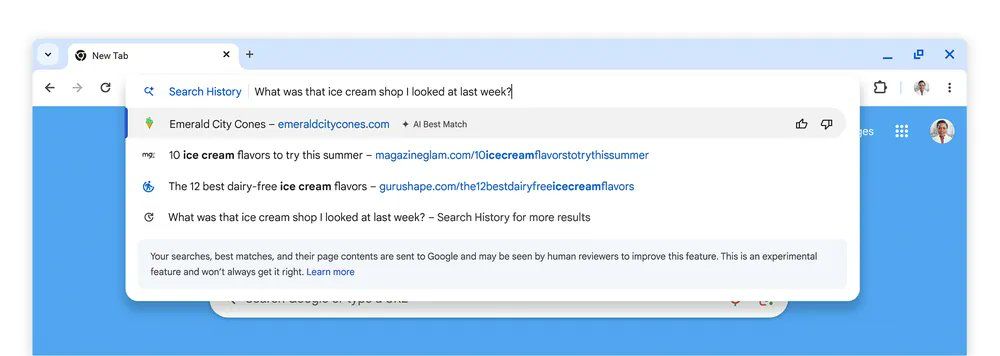 Rediscover Your Browsing History Looking for a page you visited last week? Just type a query like, "What was that ice cream shop I found last week?" into your history, and Chrome will find the relevant pages for you.