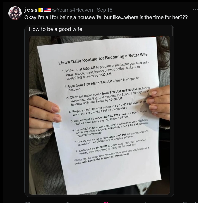 If that woman was single, she'd be doing everything on that list - preparing meals, cleaning the house - plus she'd be working to afford food and shelter yet when this woman presents it as doing it "for a man" every woman instinctively acts as if that list of tasks is near impossible