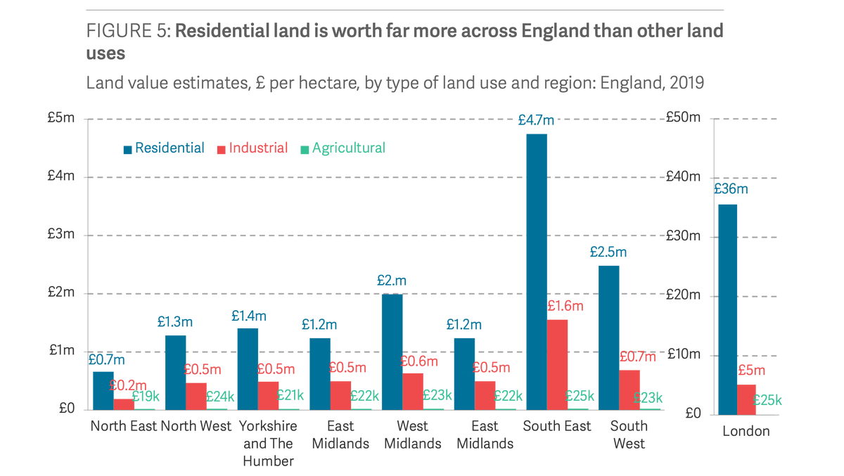 A hectare of land in the South East used for farmland can increase in value by over 180 times if its owner gets permission to build homes on it.