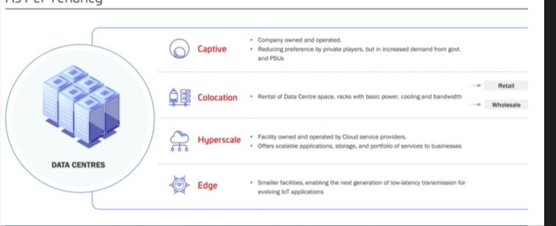 Four kinds of data centre A) captives - company owned & operativeβ B)colocation -large Data centre facilities the rent out rack spaces third party.β C) Hyperscalers:- large scale cloud services provider. β D)EDGE -smaller sizes Note - focused in green ticks