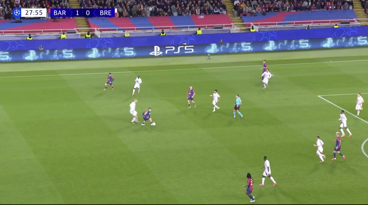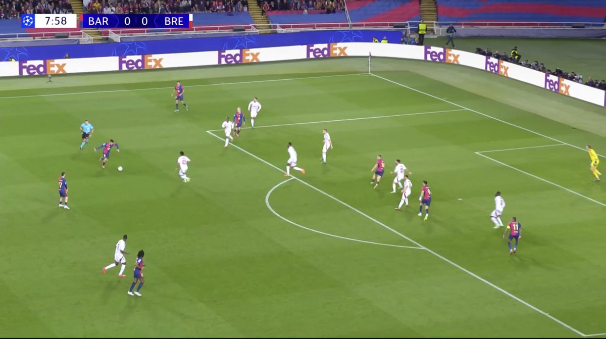 Ya en el minuto 1 se veía que ante el 4-1-4-1 del Brest, el retroceder a Pedri al campamento base habilitaría caminos hacia el gol. Juntando pases en izquierda, el FCB lograba sujetar la línea de 4 y con Pedri encontraba siempre el pase al alejado.