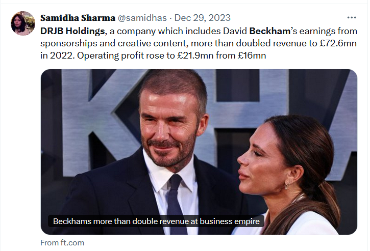 "Beckham’s company DRJB Holdings took in £72.6 million ($92.2 million) in revenues in 2022 on the back of brand deals with companies including Maserati and Adidas" x.com