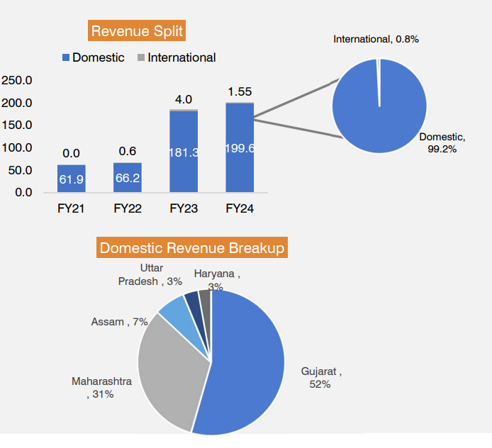 Company received 99.2% of its revenue from the domestic market and the rest 0.08% from the international market. Within the domestic market, 52% share of the revenue came from Gujarat, followed by 31% from Maharashtra, 7% from Assam, 3% from Uttar Pradesh and 3% from Haryana.