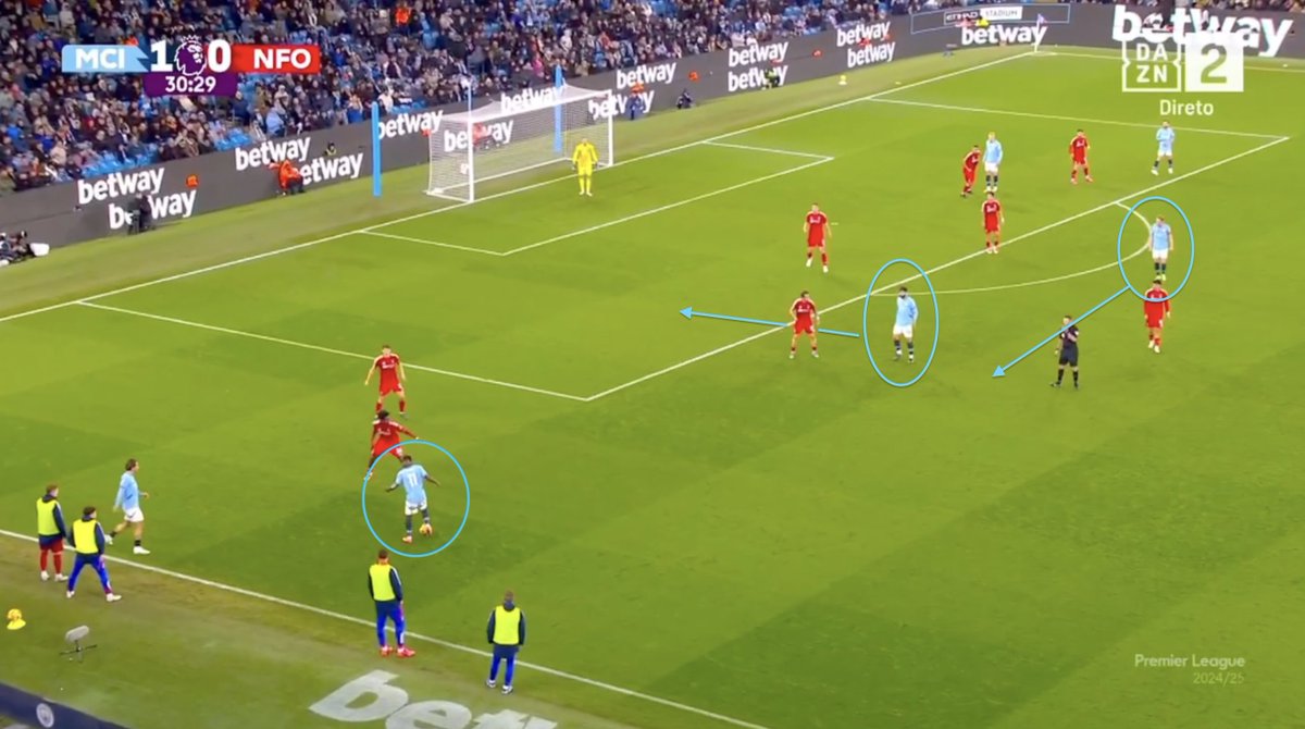 The moment that Doku sufficiently commits the direct opponent to the ball, he releases the pass.