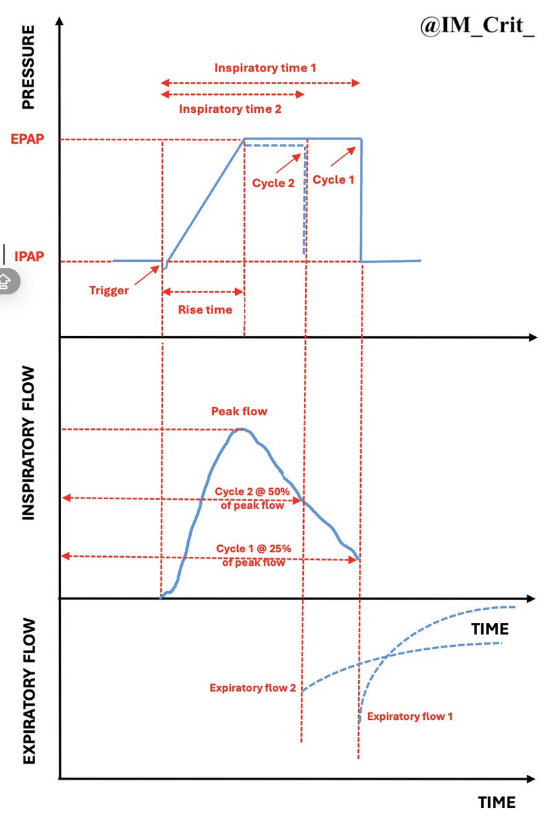 (cycling off from IPAP to EPAP) can lead to asynchrony. Cycling off the insp flow, therefore, should be set at higher sensitivity (earlier) & the peak flow is used as the "reference" signal. Please see in my poor graph how moving from cycling off #1 to #2 β¬οΈ inspiratory time x.com