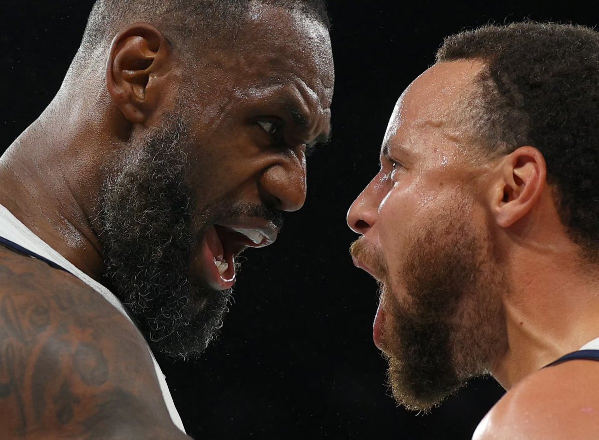 17. Lebron James and Stephen Curry of the United States celebrate after their men's basketball semifinal match against Serbia at the Paris Olympics, August 8.