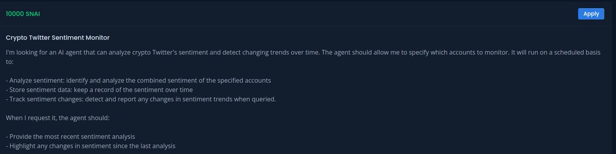 Here are some of the new bounties posted by the community. If you can code, build the agents and get paid in $SNAI: