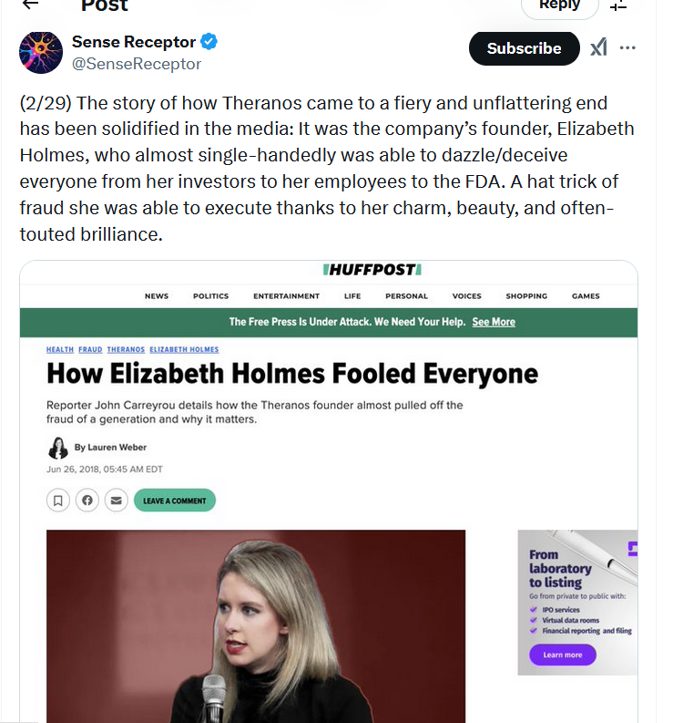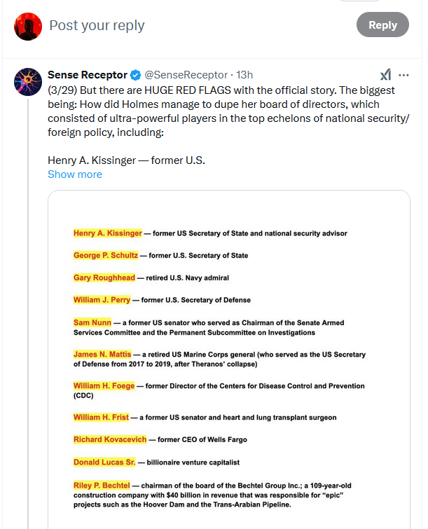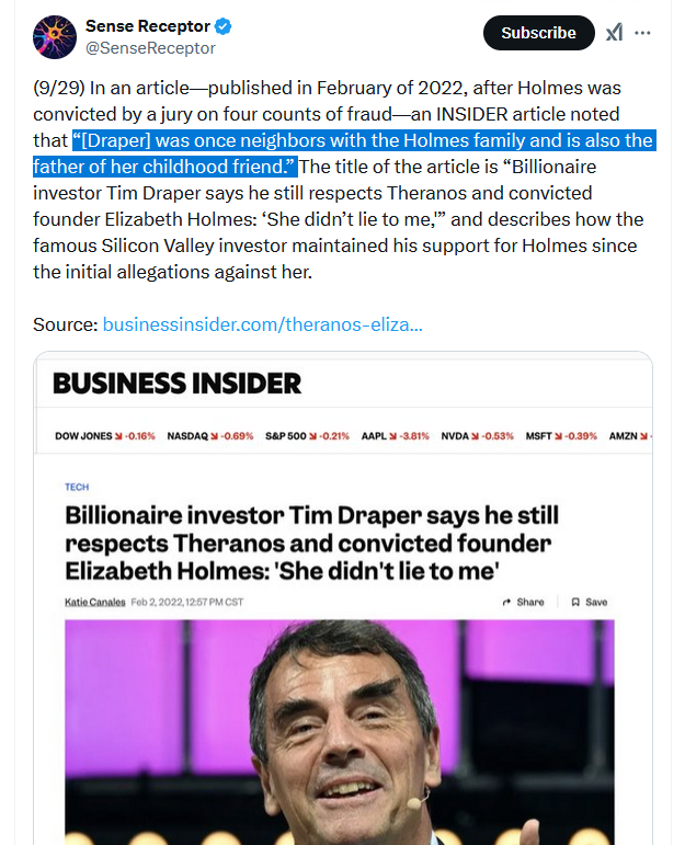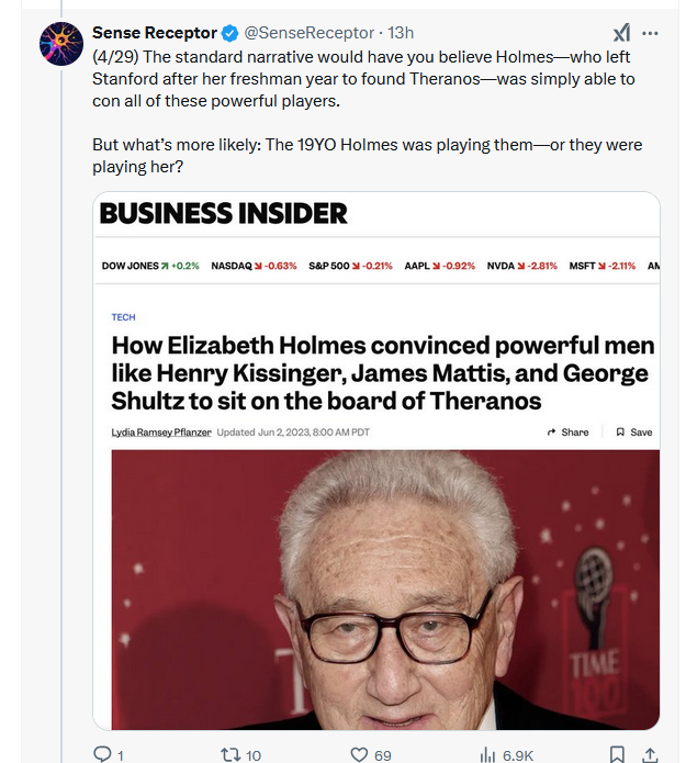 "Another BIG RED FLAG: How did Holmes manage to drain $600 million from investors like Ed. Secretary Betsy Devos, media entrepreneur Rupert Murdoch, Walton family heirs, and Oracle co-founder Larry Ellison?"