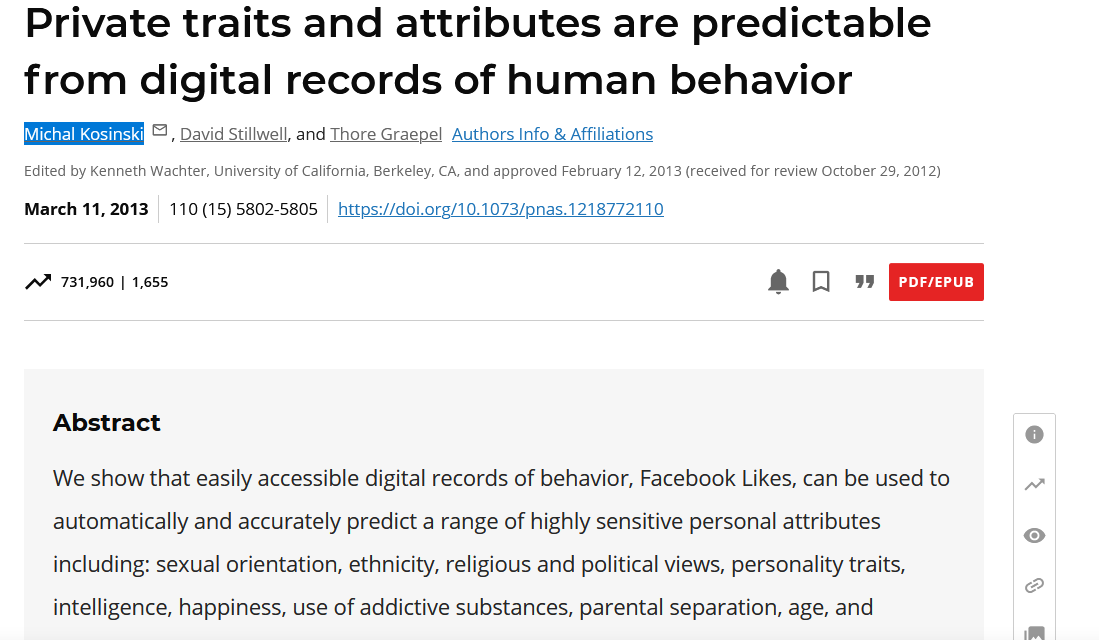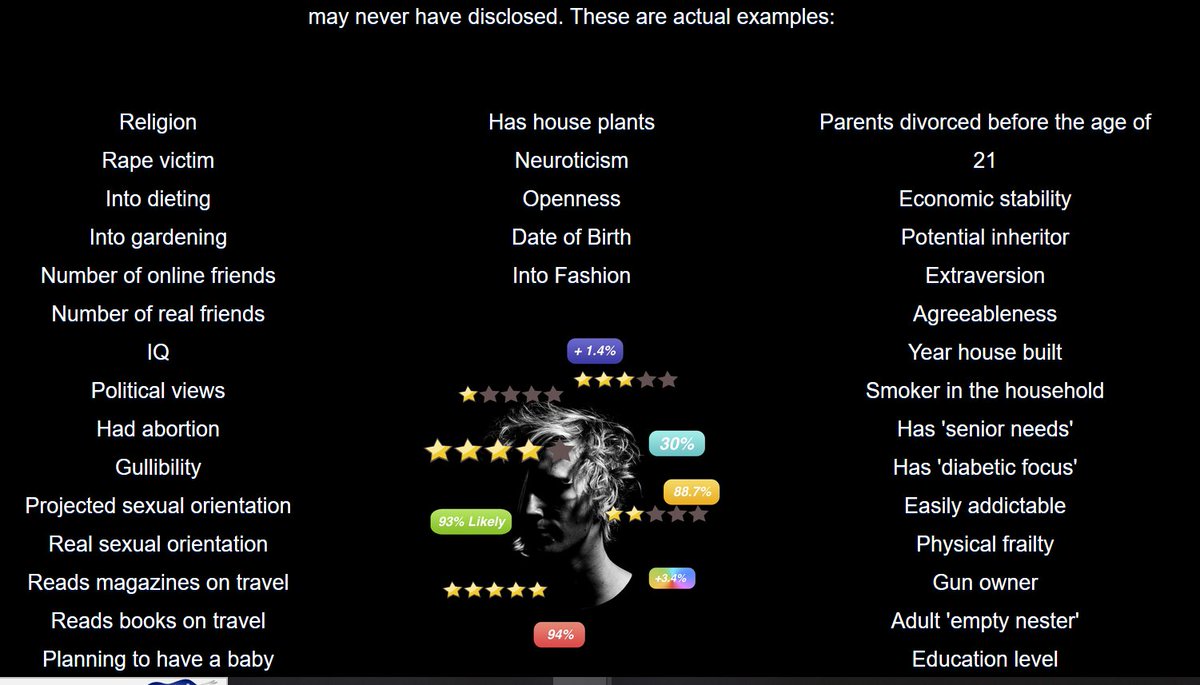 "We have solid research which shows that Facebook “likes” can be used to “automatically & accurately predict a range of personal attributes including sexual orientation, religious & political views, personality, use of addictive substances, gender”."🎶