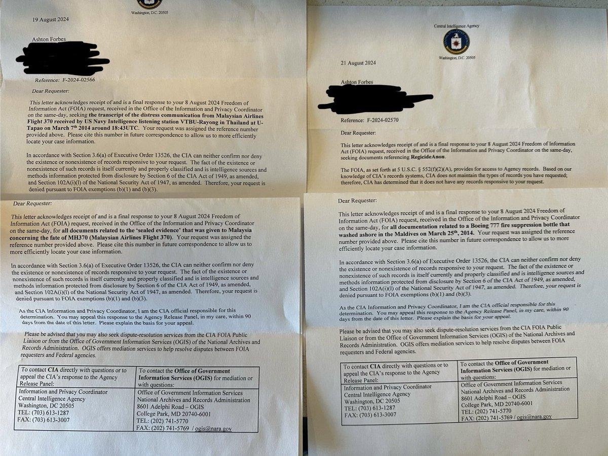 Multiple FOIA requests for data related to MH370 have been denied under claims of national security from multiple agencies. Here's denials from the CIA and NSA and FBI. x.com