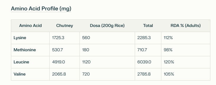 The chutney-dosa combination demonstrates evolutionary nutritional wisdom – rice compensates for peanut's methionine deficiency, while peanuts address rice's lysine limitations.