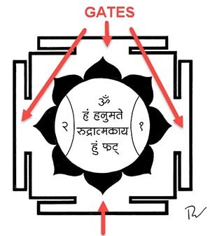 The basic form of the Hanuman yantra is a square with four gates. This is a standard form for most yantras. The square represents the four cardinal directions. A square also symbolizes the foundation or base of the material world. The numerical equivalent, of course, is four