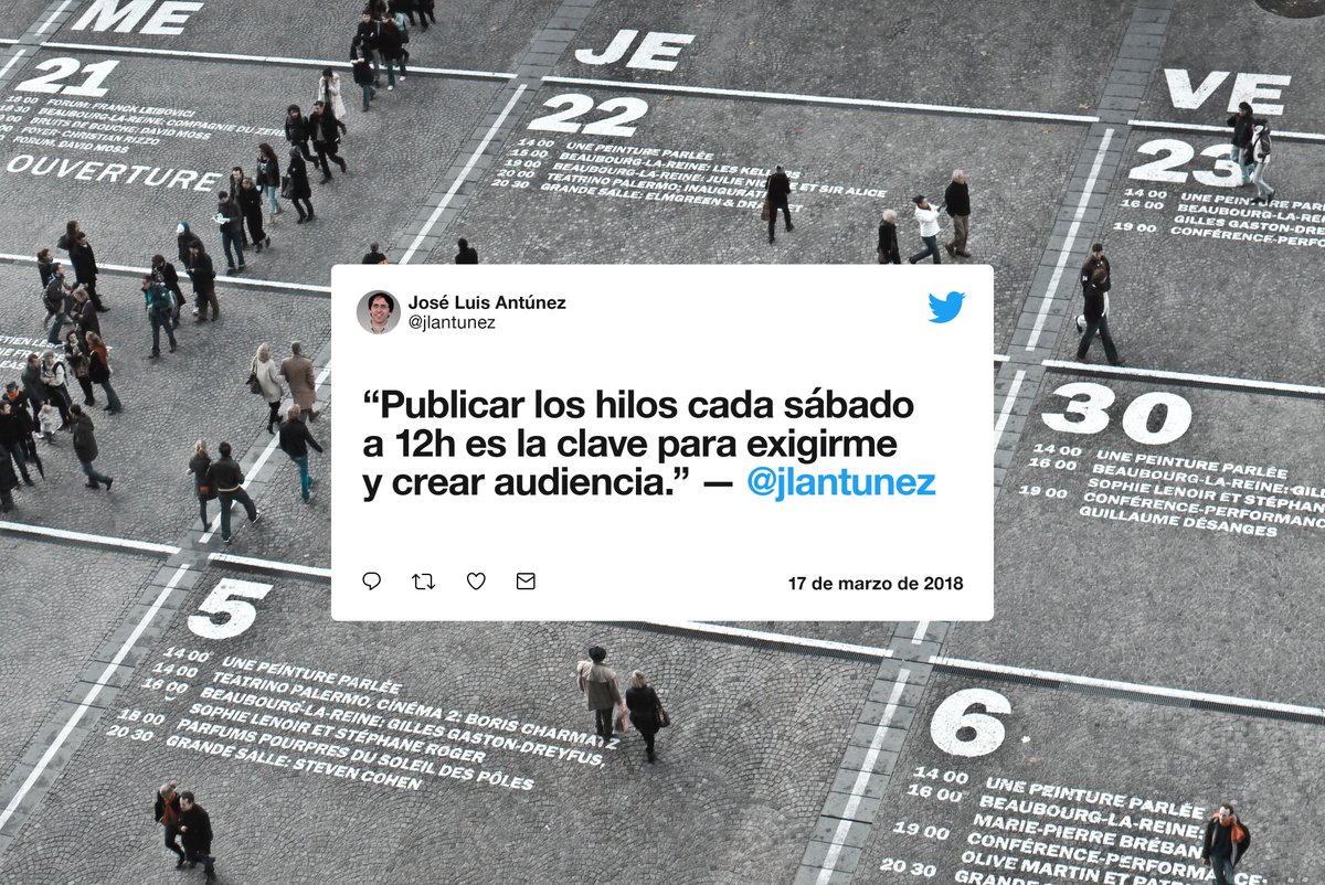 18/ He hecho 35 hilos sin fallar ni un sábado. Los primeros me llevaban 2-3 horas de preparación (documentación) de lunes a viernes y otras pocas la mañana del sábado antes de publicar. Con la práctica he bajado a 3-4 horas en total.