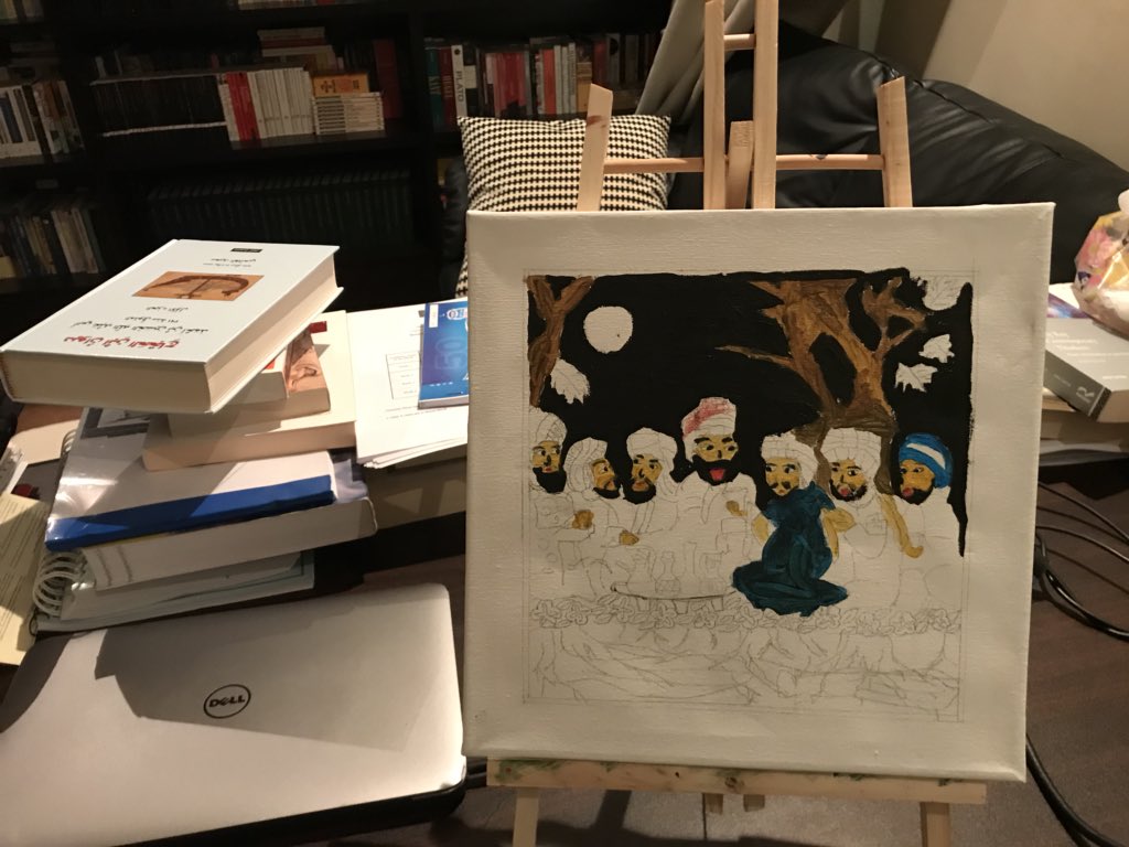 نظرت لين إلى الإسكتش وامتدحته، وهي إذا فعلت تدفعني لارتقاء الجبال. اقترحتْ عليّ أن ألوّنها، فتحمّست وأنا أتخيّل لون الليل الأليل، وزركشات الأقمشة الغنيّة، وشرعتُ ألوّن، وليتني ما فعلت! أفسدتها اللوحة مباشرة، وكرهتها، وتركتها للين تلوّنها كيف شاءت، فعاثت فيها فسادًا =